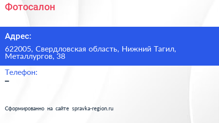 Фотосалон по адресу 622005, Свердловская область, Нижний Тагил, Металлургов, 38 в дальнейшем Организация, размещена в следующих категориях: