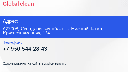Global clean по адресу 622008, Свердловская область, Нижний Тагил, Краснознамённая, 134 в дальнейшем Организация, размещена в следующих категориях: