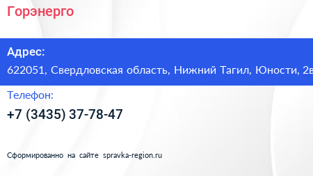 Горэнерго по адресу 622051, Свердловская область, Нижний Тагил, Юности, 2в в дальнейшем Организация, размещена в следующих категориях: