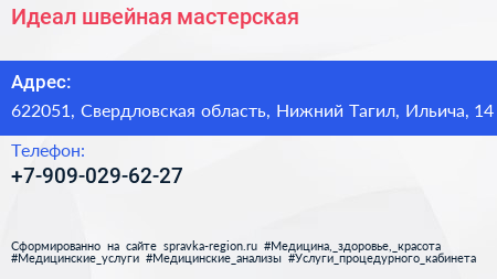 Идеал, швейная мастерская по адресу 622051, Свердловская область, Нижний Тагил, Ильича, 14 в дальнейшем Организация, размещена в следующих категориях: