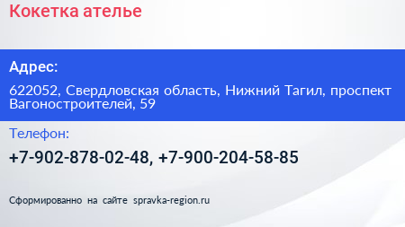Кокетка, ателье по адресу 622052, Свердловская область, Нижний Тагил, проспект Вагоностроителей, 59 в дальнейшем Организация, размещена в следующих категориях: