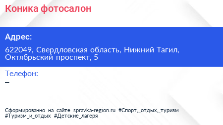 Коника, фотосалон по адресу 622049, Свердловская область, Нижний Тагил, Октябрьский проспект, 5 в дальнейшем Организация, размещена в следующих категориях:
