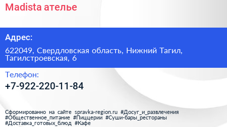 Madista, ателье по адресу 622049, Свердловская область, Нижний Тагил, Тагилстроевская, 6 в дальнейшем Организация, размещена в следующих категориях: