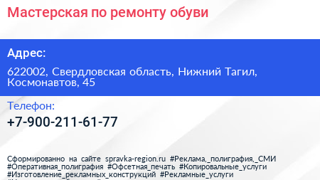 Мастерская по ремонту обуви по адресу 622002, Свердловская область, Нижний Тагил, Космонавтов, 45 в дальнейшем Организация, размещена в следующих категориях: