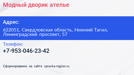 Модный дворик, ателье по адресу 622051, Свердловская область, Нижний Тагил, Ленинградский проспект, 57 в дальнейшем Организация, размещена в следующих категориях: