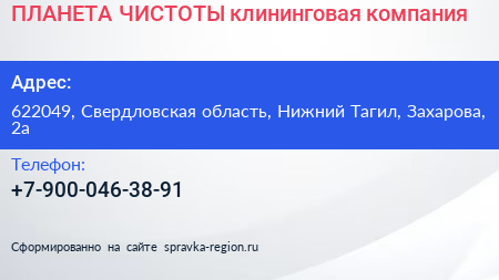 ПЛАНЕТА ЧИСТОТЫ, клининговая компания по адресу 622049, Свердловская область, Нижний Тагил, Захарова, 2а в дальнейшем Организация, размещена в следующих категориях: