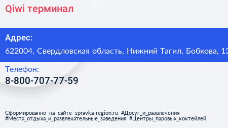 Qiwi, терминал по адресу 622004, Свердловская область, Нижний Тагил, Бобкова, 13 в дальнейшем Организация, размещена в следующих категориях: