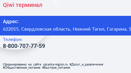 Qiwi, терминал по адресу 622015, Свердловская область, Нижний Тагил, Гагарина, 5 в дальнейшем Организация, размещена в следующих категориях: