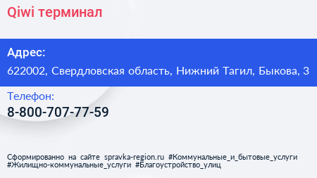 Qiwi, терминал по адресу 622002, Свердловская область, Нижний Тагил, Быкова, 3 в дальнейшем Организация, размещена в следующих категориях: