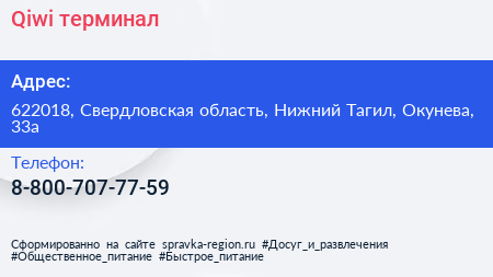 Qiwi, терминал по адресу 622018, Свердловская область, Нижний Тагил, Окунева, 33а в дальнейшем Организация, размещена в следующих категориях: