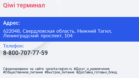 Qiwi, терминал по адресу 622048, Свердловская область, Нижний Тагил, Ленинградский проспект, 104 в дальнейшем Организация, размещена в следующих категориях: