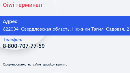 Qiwi, терминал по адресу 622034, Свердловская область, Нижний Тагил, Садовая, 2 в дальнейшем Организация, размещена в следующих категориях: