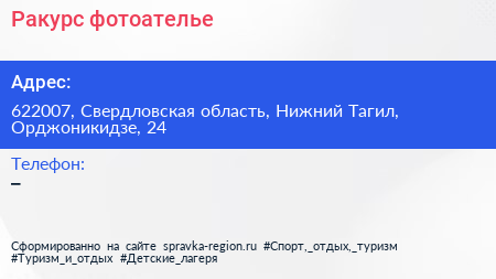 Ракурс, фотоателье по адресу 622007, Свердловская область, Нижний Тагил, Орджоникидзе, 24 в дальнейшем Организация, размещена в следующих категориях: