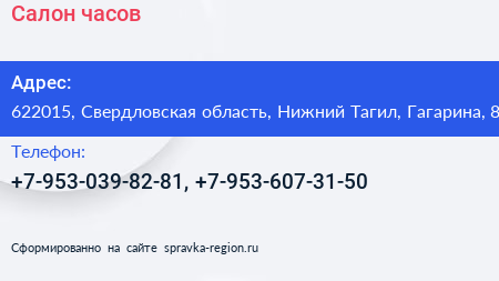 Салон часов по адресу 622015, Свердловская область, Нижний Тагил, Гагарина, 8 в дальнейшем Организация, размещена в следующих категориях: