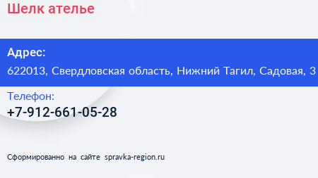 Шелк, ателье по адресу 622013, Свердловская область, Нижний Тагил, Садовая, 3 в дальнейшем Организация, размещена в следующих категориях: