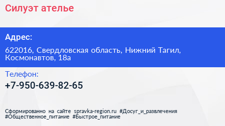 Силуэт, ателье по адресу 622016, Свердловская область, Нижний Тагил, Космонавтов, 18а в дальнейшем Организация, размещена в следующих категориях: