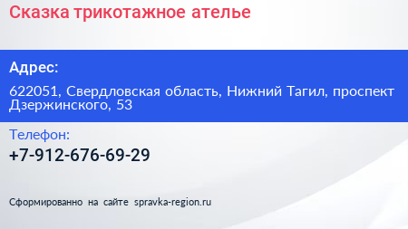 Сказка, трикотажное ателье по адресу 622051, Свердловская область, Нижний Тагил, проспект Дзержинского, 53 в дальнейшем Организация, размещена в следующих категориях: