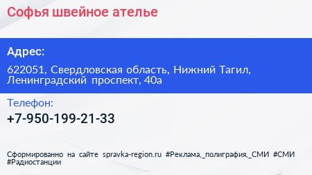 Софья, швейное ателье по адресу 622051, Свердловская область, Нижний Тагил, Ленинградский проспект, 40а в дальнейшем Организация, размещена в следующих категориях: