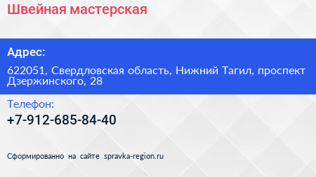 Швейная мастерская по адресу 622051, Свердловская область, Нижний Тагил, проспект Дзержинского, 28 в дальнейшем Организация, размещена в следующих категориях: