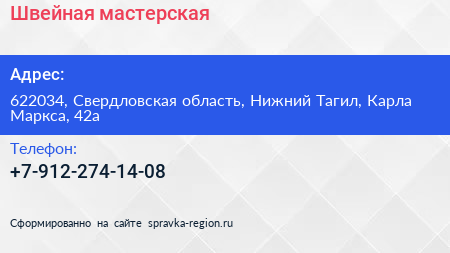 Швейная мастерская по адресу 622034, Свердловская область, Нижний Тагил, Карла Маркса, 42а в дальнейшем Организация, размещена в следующих категориях: