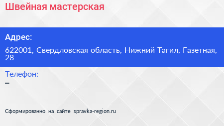 Швейная мастерская по адресу 622001, Свердловская область, Нижний Тагил, Газетная, 28 в дальнейшем Организация, размещена в следующих категориях: