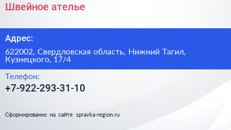 Швейное ателье по адресу 622002, Свердловская область, Нижний Тагил, Кузнецкого, 17/4 в дальнейшем Организация, размещена в следующих категориях: