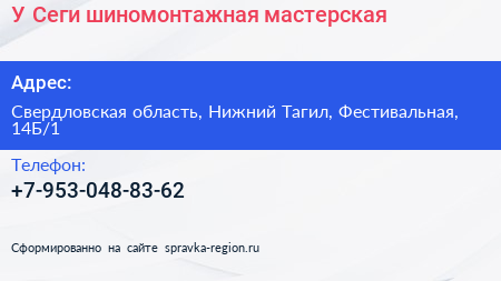 У Сеги, шиномонтажная мастерская по адресу Свердловская область, Нижний Тагил, Фестивальная, 14Б/1 в дальнейшем Организация, размещена в следующих категориях:
