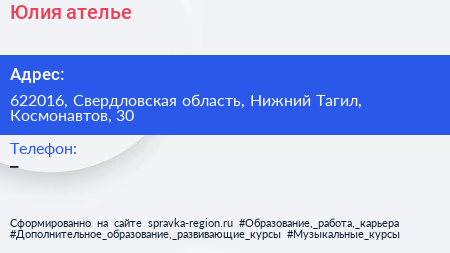 Юлия, ателье по адресу 622016, Свердловская область, Нижний Тагил, Космонавтов, 30 в дальнейшем Организация, размещена в следующих категориях: