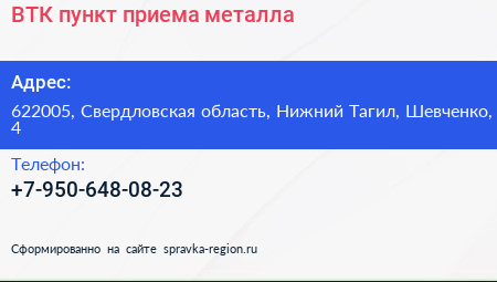 ВТК, пункт приема металла по адресу 622005, Свердловская область, Нижний Тагил, Шевченко, 4 в дальнейшем Организация, размещена в следующих категориях: