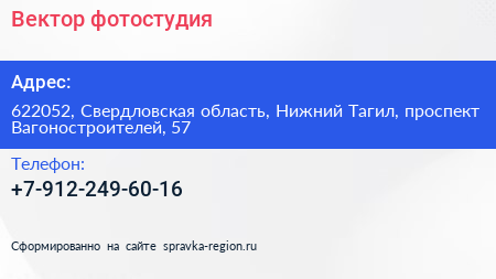 Вектор, фотостудия по адресу 622052, Свердловская область, Нижний Тагил, проспект Вагоностроителей, 57 в дальнейшем Организация, размещена в следующих категориях: