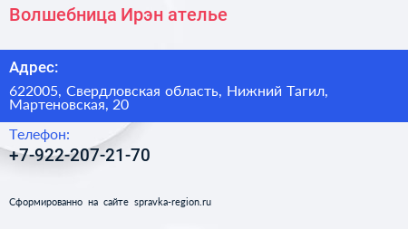 Волшебница Ирэн, ателье по адресу 622005, Свердловская область, Нижний Тагил, Мартеновская, 20 в дальнейшем Организация, размещена в следующих категориях: