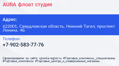 AURA, флоат-студия по адресу 622001, Свердловская область, Нижний Тагил, проспект Ленина, 4Б в дальнейшем Организация, размещена в следующих категориях: