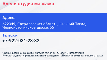 Адель, студия массажа по адресу 622049, Свердловская область, Нижний Тагил, Черноисточинское шоссе, 55 в дальнейшем Организация, размещена в следующих категориях: