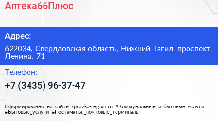 Аптека66Плюс по адресу 622034, Свердловская область, Нижний Тагил, проспект Ленина, 71 в дальнейшем Организация, размещена в следующих категориях: