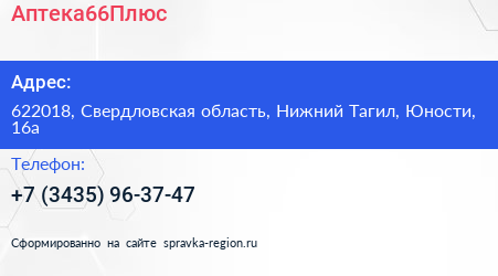 Аптека66Плюс по адресу 622018, Свердловская область, Нижний Тагил, Юности, 16а в дальнейшем Организация, размещена в следующих категориях: