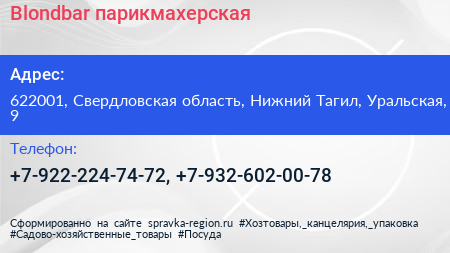 Blondbar, парикмахерская по адресу 622001, Свердловская область, Нижний Тагил, Уральская, 9 в дальнейшем Организация, размещена в следующих категориях: