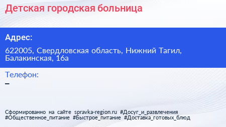 Детская городская больница по адресу 622005, Свердловская область, Нижний Тагил, Балакинская, 16а в дальнейшем Организация, размещена в следующих категориях: