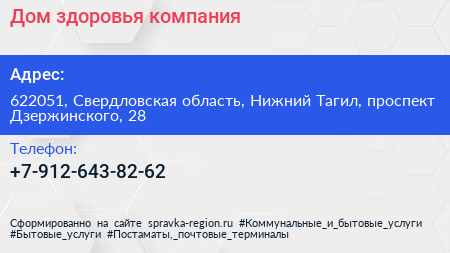 Дом здоровья, компания по адресу 622051, Свердловская область, Нижний Тагил, проспект Дзержинского, 28 в дальнейшем Организация, размещена в следующих категориях: