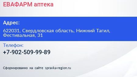 ЕВАФАРМ, аптека по адресу 622031, Свердловская область, Нижний Тагил, Фестивальная, 31 в дальнейшем Организация, размещена в следующих категориях: