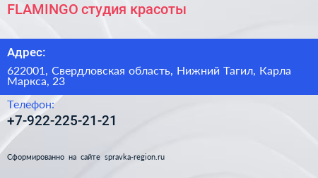 FLAMINGO, студия красоты по адресу 622001, Свердловская область, Нижний Тагил, Карла Маркса, 23 в дальнейшем Организация, размещена в следующих категориях: