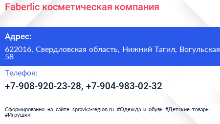 Faberlic, косметическая компания по адресу 622016, Свердловская область, Нижний Тагил, Вогульская, 58 в дальнейшем Организация, размещена в следующих категориях: