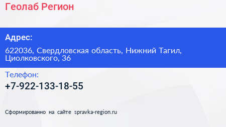 Геолаб Регион по адресу 622036, Свердловская область, Нижний Тагил, Циолковского, 36 в дальнейшем Организация, размещена в следующих категориях: