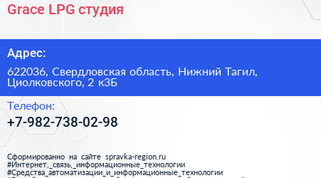 Grace LPG, студия по адресу 622036, Свердловская область, Нижний Тагил, Циолковского, 2 к3Б в дальнейшем Организация, размещена в следующих категориях: