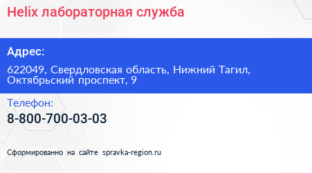 Helix, лабораторная служба по адресу 622049, Свердловская область, Нижний Тагил, Октябрьский проспект, 9 в дальнейшем Организация, размещена в следующих категориях: