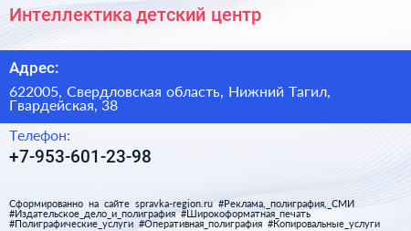 Интеллектика, детский центр по адресу 622005, Свердловская область, Нижний Тагил, Гвардейская, 38 в дальнейшем Организация, размещена в следующих категориях: