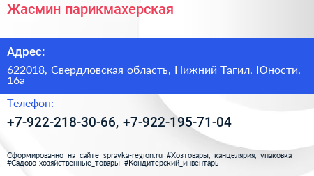 Жасмин, парикмахерская по адресу 622018, Свердловская область, Нижний Тагил, Юности, 16а в дальнейшем Организация, размещена в следующих категориях: