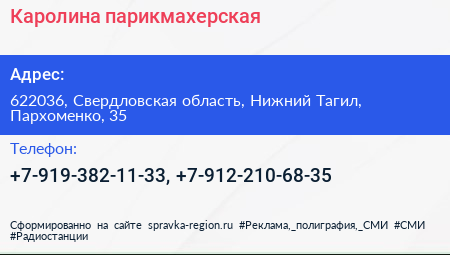 Каролина, парикмахерская по адресу 622036, Свердловская область, Нижний Тагил, Пархоменко, 35 в дальнейшем Организация, размещена в следующих категориях: