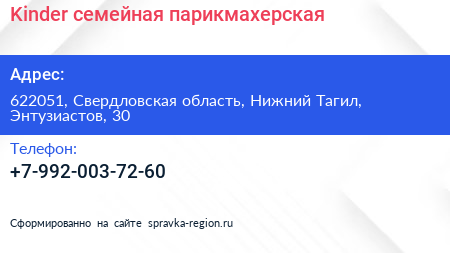 Kinder, семейная парикмахерская по адресу 622051, Свердловская область, Нижний Тагил, Энтузиастов, 30 в дальнейшем Организация, размещена в следующих категориях: