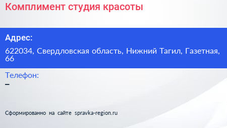 Комплимент, студия красоты по адресу 622034, Свердловская область, Нижний Тагил, Газетная, 66 в дальнейшем Организация, размещена в следующих категориях: