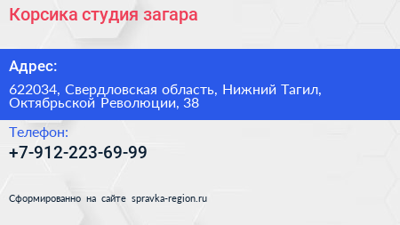 Корсика, студия загара по адресу 622034, Свердловская область, Нижний Тагил, Октябрьской Революции, 38 в дальнейшем Организация, размещена в следующих категориях:
